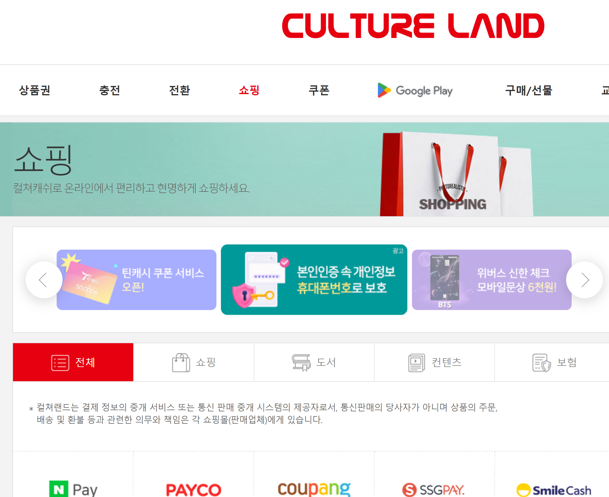 결제 단계에 도달하면 일반적으로 여러 결제 방법이 제공됩니다. 문화상품권을 사용하려면 해당 옵션을 선택해야 합니다. "문화상품권" 또는 "상품권"과 같은 이름으로 표시될 수 있습니다.
