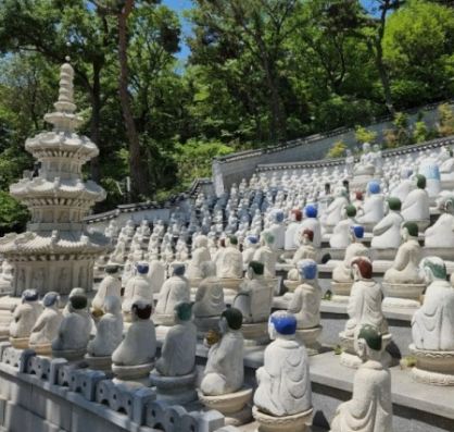 그곳에서 섬에 위치한 또 다른 아름다운 사찰인 전등사로 향합니다. 이 사찰은 아름다운 정원과 한국 전통 건축으로 유명합니다.